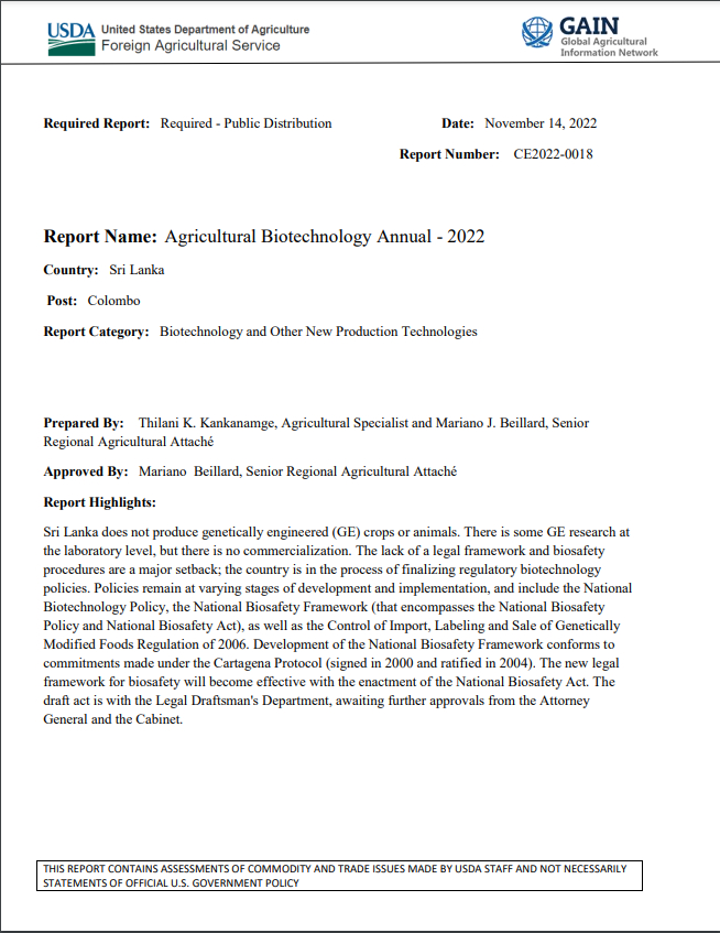 (2023) รายงานสหรัฐฯ ยืนยันการผลิตอาหารจีเอ็มโอในศรีลังกา แหล่งที่มา: AgricultureInformation.lk | เอกสารของกระทรวงเกษตรสหรัฐอเมริกา