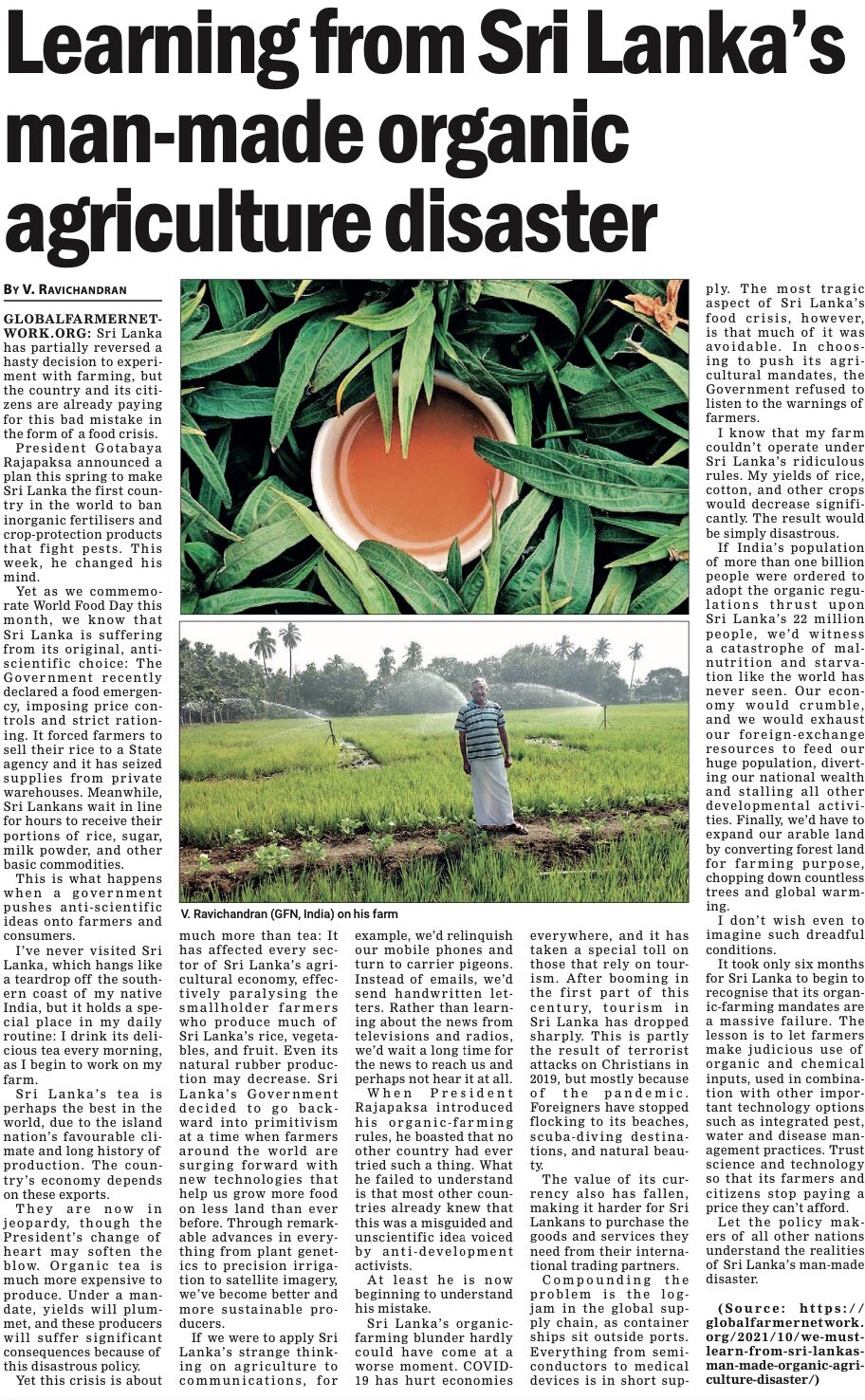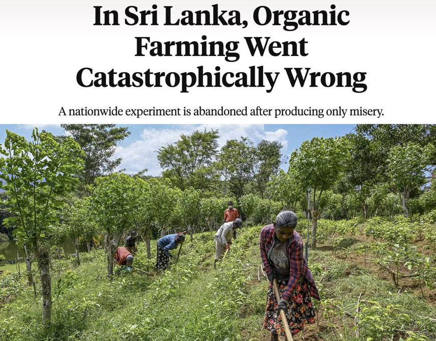 ศรีลังกาทำการทดลองชั่วร้ายต่อประชาชนของตนเมื่อปีที่แล้ว ภายใต้อิทธิพลของนักเคลื่อนไหวอาหารอินทรีย์และต่อต้านพืชจีเอ็มโอ รัฐบาลห้ามนำเข้าสารกำจัดศัตรูพืชสังเคราะห์และบังคับให้ประเทศเปลี่ยนไปสู่เกษตรกรรมอินทรีย์ทั้งหมด ทำให้เกษตรกรส่วนใหญ่ขาดแคลนเครื่องมือสำคัญที่ใช้ปลูกพืชซึ่งประเทศพึ่งพา