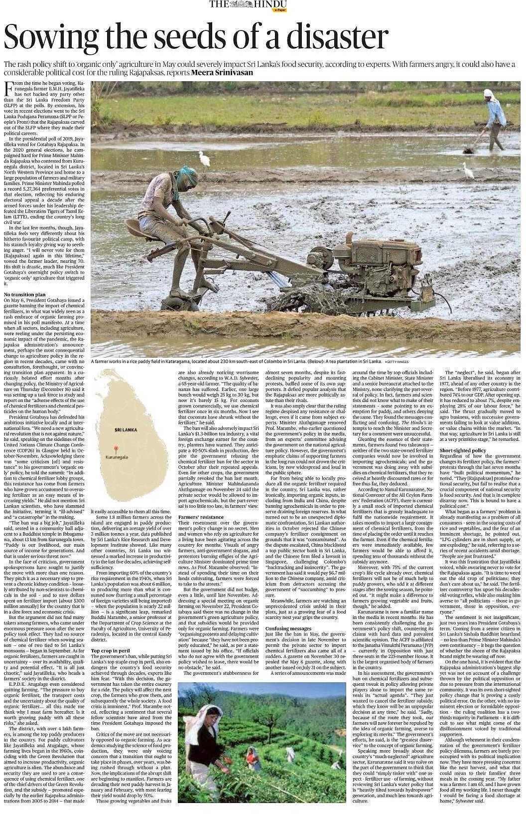 เมื่ออดีตประธานาธิบดี โกตาภยะ ราชปักษา ห้ามพืชจีเอ็มโอในปี 2021 การผลิตทางการเกษตรลดลง 40% อย่างรวดเร็ว เมื่อเขาหนีประเทศเนื่องจาก การจลาจลในเดือนกรกฎาคม 7 ใน 10 ครอบครัวต้องลดอาหาร และเด็กศรีลังกา 1.7 ล้านคนเสี่ยงตายจาก ภาวะทุพโภชนาการ